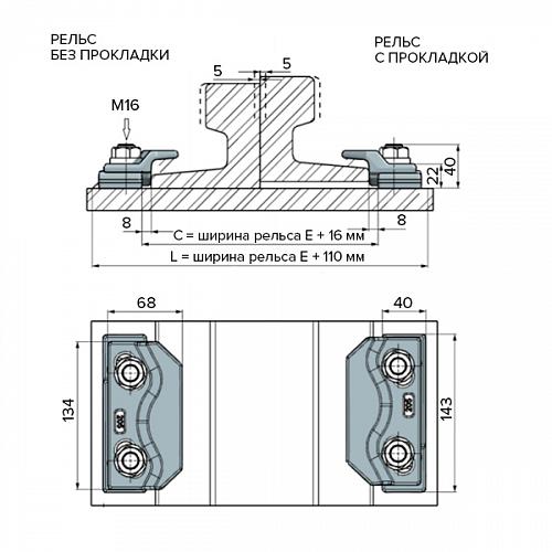 Планка данной серии состоит из двух элементов, смещенных относительно друг друга. При монтаже они закрепляются посредством высокопрочных болтов М16 сl 8.8 и гаек, после чего нижняя часть приваривается для создания полного и надежного прилегания рельса к основанию. Для эластичной фиксации подошвы рельсовой балки рекомендуется использовать амортизирующие прокладки, которые идут в комплекте с планками.