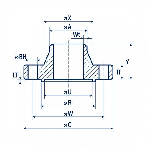 Стальной воротниковый фланец с крупным шипом (LT) 2" – вид трубопроводной арматуры, представляющий собой дискообразную деталь с симметричными отверстиями под крепеж (шпильки или болты). Осесимметрично расположенный конусообразный выступ - воротник (шея, юбка), необходим для прочной приварки встык фланца к трубе. Также воротник обеспечивает плавный переход от фланца к трубе/фитингу при многократных сгибах. Стальной воротниковый фланец толщиной #TOLSHCHINA_FLANTSA_MIN_TF_MM_S# мм и высотой 68,3 мм не создает препятствий для движения потока и обеспечивает герметичное соединение.